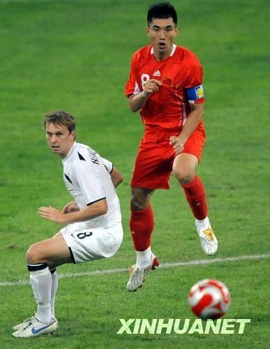 8月7日,中國(guó)國(guó)奧隊(duì)球員鄭智(右)與新西蘭國(guó)奧隊(duì)球員在比賽中爭(zhēng)搶。當(dāng)日,在沈陽(yáng)進(jìn)行的北京奧運(yùn)會(huì)男子足球C組的比賽中,中國(guó)國(guó)奧隊(duì)對(duì)陣新西蘭國(guó)奧隊(duì)。新華社記者任勇攝