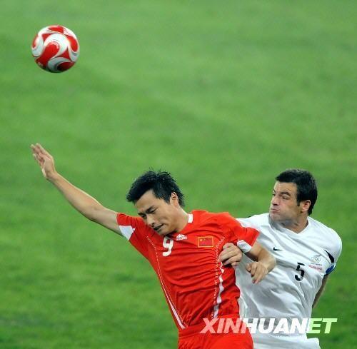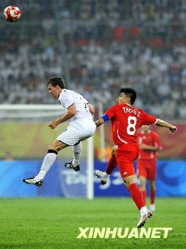 8月7日,中國(guó)國(guó)奧隊(duì)球員郜林(左)與新西蘭國(guó)奧隊(duì)球員內(nèi)爾森爭(zhēng)頂頭球。當(dāng)日,在沈陽(yáng)進(jìn)行的北京奧運(yùn)會(huì)男子足球C組的比賽中,中國(guó)國(guó)奧隊(duì)對(duì)陣新西蘭國(guó)奧隊(duì)。新華社記者謝環(huán)馳攝