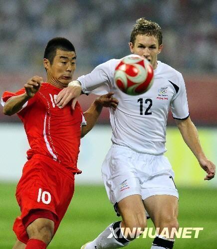 8月7日,中國國奧隊球員韓鵬(左)與新西蘭國奧隊球員奧爾德在比賽中爭搶。當(dāng)日,在沈陽進(jìn)行的北京奧運(yùn)會男子足球C組的比賽中,中國國奧隊對陣新西蘭國奧隊。新華社記者任勇攝