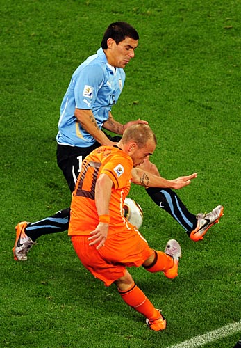 被人們用懷疑的目光注視著,荷蘭在半決賽上的任何爭議自然被放大。不幸的是,爭議果然如期而至,而且決定了比賽的走勢。當荷蘭和烏拉圭直到第70分鐘還是1-1平時,斯內(nèi)德在前場左側一記射門,處在越位位置上的范佩西伸腿夠球,但卻在皮球觸到自己之前又躲了開去。雖然范佩西最終沒有碰到皮球,但他的假動作明顯干擾到了烏拉圭門將的判斷,按規(guī)則這應該判越位,進球無效。但裁判卻對這一切無動于衷,荷蘭隊由此取得領先,并最終一舉奠定勝局。