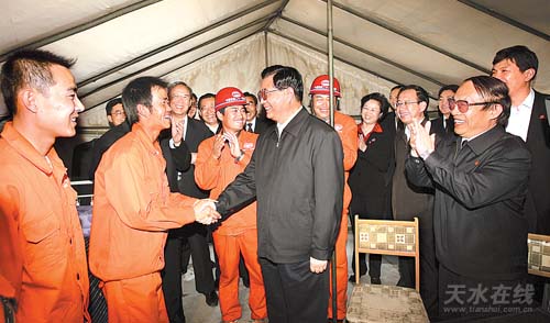 2006年7月1日,胡錦濤總書記在格爾木建設(shè)工地親切接見了中鐵二十一局盧長德、李建民、王江為、楊洋、王建東5位青年技術(shù)人員。周德民攝