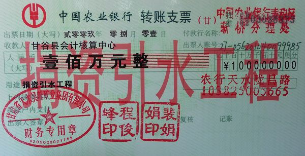 西北部農(nóng)村飲水安全工程捐款100萬(wàn)元
