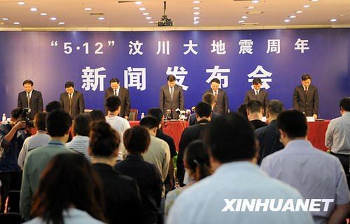 5月7日,全體人員在新聞發(fā)布會前為地震遇難者默哀。金良快 攝