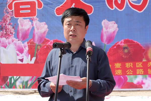麥積區(qū)委書記蔣曉強代表區(qū)委、區(qū)政府和全區(qū)58萬人民對辛勤奮戰(zhàn)在寶天高速公路建設(shè)一線的廣大建設(shè)者表示親切的慰問和崇高的敬意。他說,寶天高速公路甘肅段是國家確定的西部大開發(fā)十大重點工程之一,也是打通甘肅東出口的重要通道,更是天水乃至甘肅經(jīng)濟騰飛的新航道。為了支援西部大開發(fā)、建好寶天高速路,廣大建設(shè)者從五湖四海來到隴上江南的麥積區(qū)安營扎寨,風(fēng)餐露宿,克難攻堅,苦干實干,使工程建設(shè)取得重大進展。特別是廣大建設(shè)者在工程建設(shè)中表現(xiàn)出來的求真務(wù)實的工作態(tài)度、科學(xué)管理的嚴謹作風(fēng)、頑強拼搏的進取精神、默默無聞的奉獻意識,更為麥積區(qū)廣大勞動者樹立了學(xué)習(xí)的榜樣,建設(shè)者們?yōu)閷毺旄咚俟方ㄔO(shè)付出的辛勤勞動和汗水將永遠銘記在麥積人民心中。