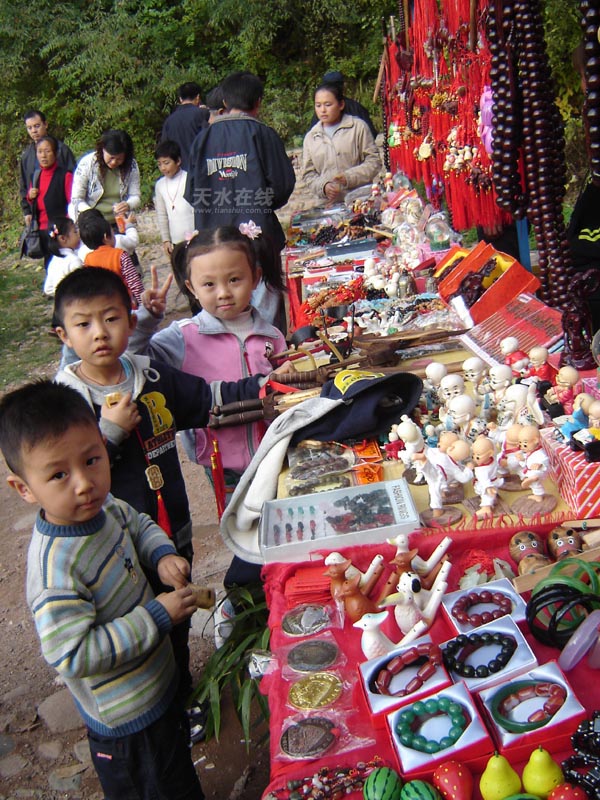麥積山石窟旅游紀(jì)念品銷(xiāo)售攤點(diǎn)前的小朋友