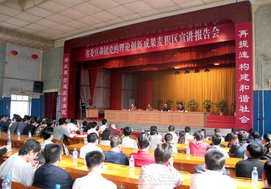 省委黨的理論創(chuàng)新成果宣講團的宣講報告,受到了麥積區(qū)委、區(qū)政府的高度重視和大力支持。麥積區(qū)委副書記楊保珍在該首場報告會上,要求全區(qū)各鄉(xiāng)鎮(zhèn)、各部門要以本次宣講活動為契機,認(rèn)真做好黨的理論創(chuàng)新成果的學(xué)習(xí)宣傳貫徹,做到“三個結(jié)合”,即:把學(xué)習(xí)黨的理論創(chuàng)新成果與解放思想、提高認(rèn)識結(jié)合起來、與貫徹落實省第十一次黨代會結(jié)合起來、與推進當(dāng)前各項工作結(jié)合起來,進一步實現(xiàn)麥積區(qū)經(jīng)濟社會的又好又快發(fā)展。