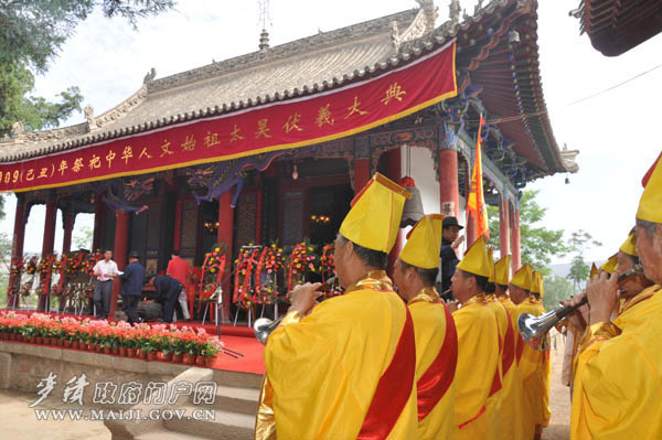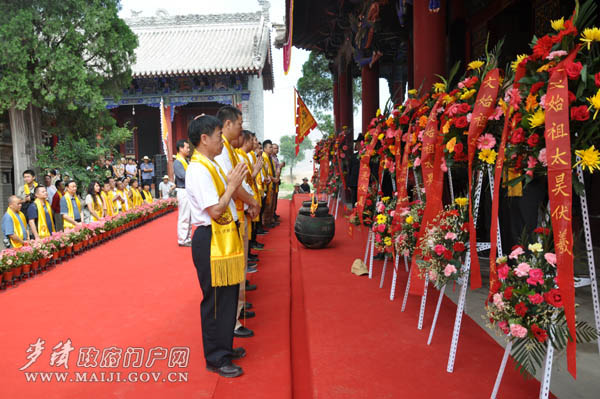 大哉羲皇,百王之先。誕生成紀(jì),居渭之陽。畫卦結(jié)繩,大道開源......古聲古韻的祭文在卦臺(tái)山上激蕩。參加祭祀活動(dòng)的專家、學(xué)者和企業(yè)家在古樂隊(duì)演奏的“祭祀樂”中依次向太昊伏羲敬獻(xiàn)了花藍(lán),并觀仰伏羲圣像。