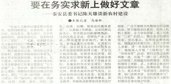 “社會(huì)主義新農(nóng)村建設(shè)要立足縣情,堅(jiān)持因地制宜、分類指導(dǎo),總體規(guī)劃、突出重點(diǎn)、量力而行、分步實(shí)施的原則。就秦安縣而言,就要做到七個(gè)‘求新’。日前,記者就社會(huì)主義新農(nóng)村建設(shè)工作采訪秦安縣委書記陳天雄時(shí),他這樣說。
