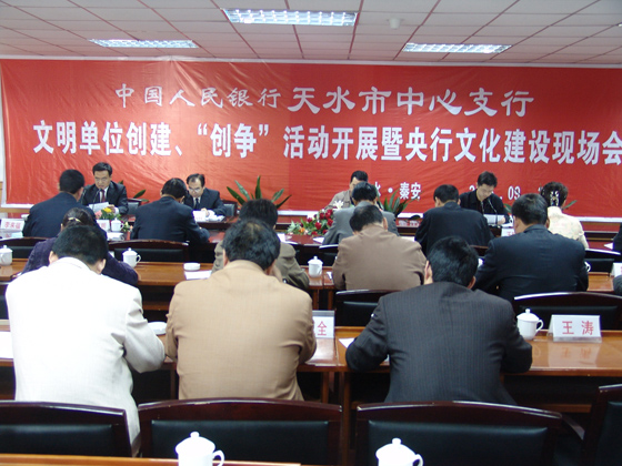 9月28日,中國人民銀行天水市中心支行文明單位創(chuàng)建、“創(chuàng)爭”活動開展暨央行文化建設(shè)現(xiàn)場會在秦安隆重召開。市中支各科室負責人、各縣支行行長、紀檢組長、辦公室主任共40人參加。