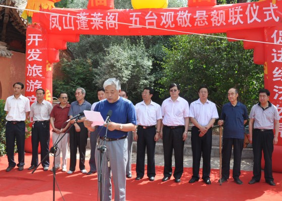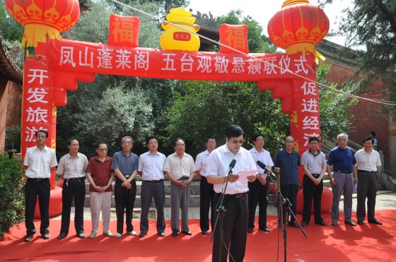 為了豐富鳳山景區(qū)文化內(nèi)涵,提升鳳山景區(qū)楹聯(lián)文化品位,推動我縣文化事業(yè)發(fā)展。2009年6月23日,秦安縣隆重舉行鳳山蓬萊閣、五臺觀敬懸額聯(lián)儀式,這次敬懸額聯(lián)儀式充分體現(xiàn)了縣委、縣政府建設(shè)鳳山景區(qū)的信心和決心,體現(xiàn)了秦安籍在外人士關(guān)注家鄉(xiāng)文化事業(yè)發(fā)展的赤誠之情,體現(xiàn)了文化界知名人士參與全縣文化事業(yè)發(fā)展的滿腔熱忱,對于推動全縣經(jīng)濟(jì)社會又好又快發(fā)展具有十分重要的意義。參加今天揭牌儀式的有:蘭州大學(xué)副校長、教授、博士生導(dǎo)師安黎哲,蘭州大學(xué)生命科學(xué)院劉江濤主任,秦安縣委書記陳天雄,縣委副書記、縣長王東紅,縣委常委、副縣長張璞銀,縣委常委李尚平,縣人大常委會副主任魏千乙,縣政協(xié)副主席馬振寰,縣政協(xié)副主席李平正,原縣人大常委會副主任王元喜,原縣政協(xié)副主席安守義,縣直相關(guān)部門負(fù)責(zé)人,文化、文物系統(tǒng)全體干部職工,文化界部分知名人士和城區(qū)群眾代表共100多人。