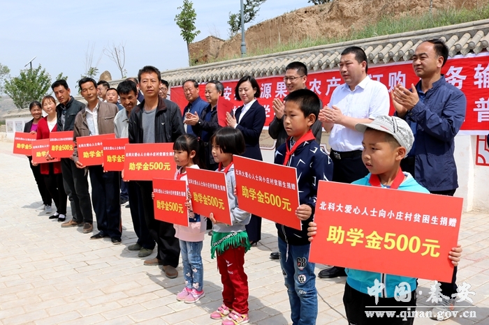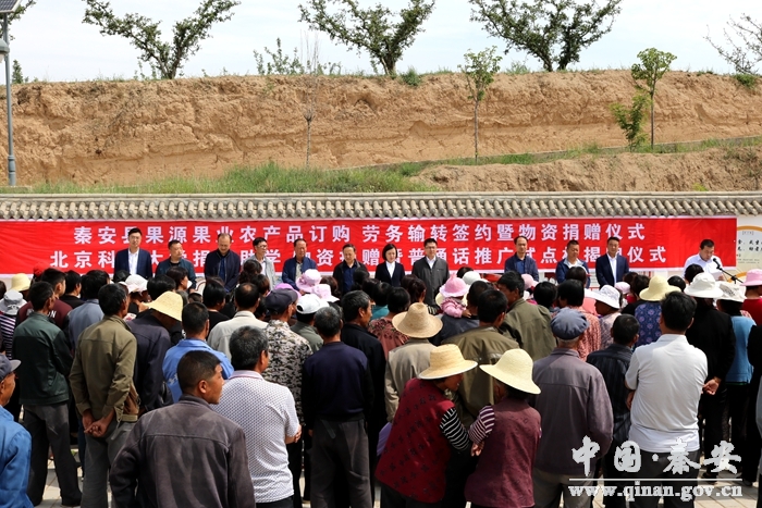 儀式上,秦安縣果源果業(yè)專業(yè)合作社與小莊村簽訂了農產(chǎn)品收購和勞務輸轉合同,并以市場收購價提前訂購全村300多戶村民的蘋果;與會領導代表北京科技大學公益組織向貧困戶轉贈了一批有機農藥,向梁山小學轉贈了500冊勵志圖書,為村民發(fā)放果源果業(yè)專業(yè)合作社捐贈的13噸化肥,并向北京科技大學愛心人士“一對一”資助的10名貧困生頒發(fā)愛心助學金,同時,還為普通話推廣試點村揭牌?h委常委、組織部長肖江作了講話。
