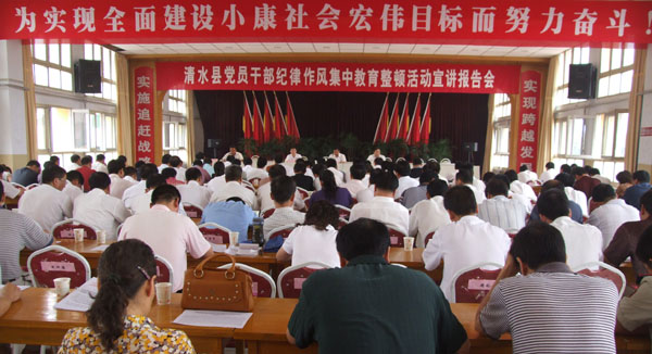 (清水縣委對外宣傳辦公室 劉海仙 楊兆康)為了推動全縣黨員干部紀(jì)律作風(fēng)集中教育整頓活動的深入開展,切實增強(qiáng)紀(jì)律作風(fēng)整頓實效,清水縣在各鄉(xiāng)鎮(zhèn)、各單位召開宣講報告會的基礎(chǔ)上,于7月28日在軒轅賓館北二樓會議室召開全縣黨員干部紀(jì)律作風(fēng)教育整頓活動宣講報告會。縣委副書記李寬余,縣委常委、紀(jì)委書記妥國保,縣委常委、組織部長張思佳等領(lǐng)導(dǎo)出席報告會,各鄉(xiāng)鎮(zhèn)黨委書記、人大主席、紀(jì)檢書記及縣直有關(guān)負(fù)責(zé)同志240多人參加了會議。