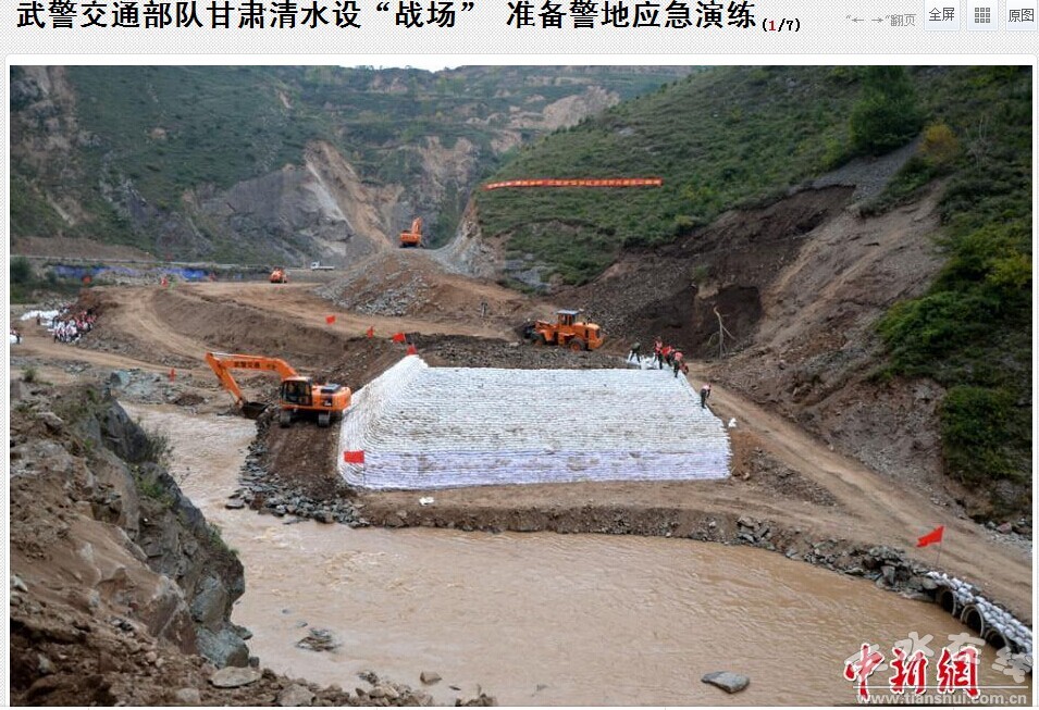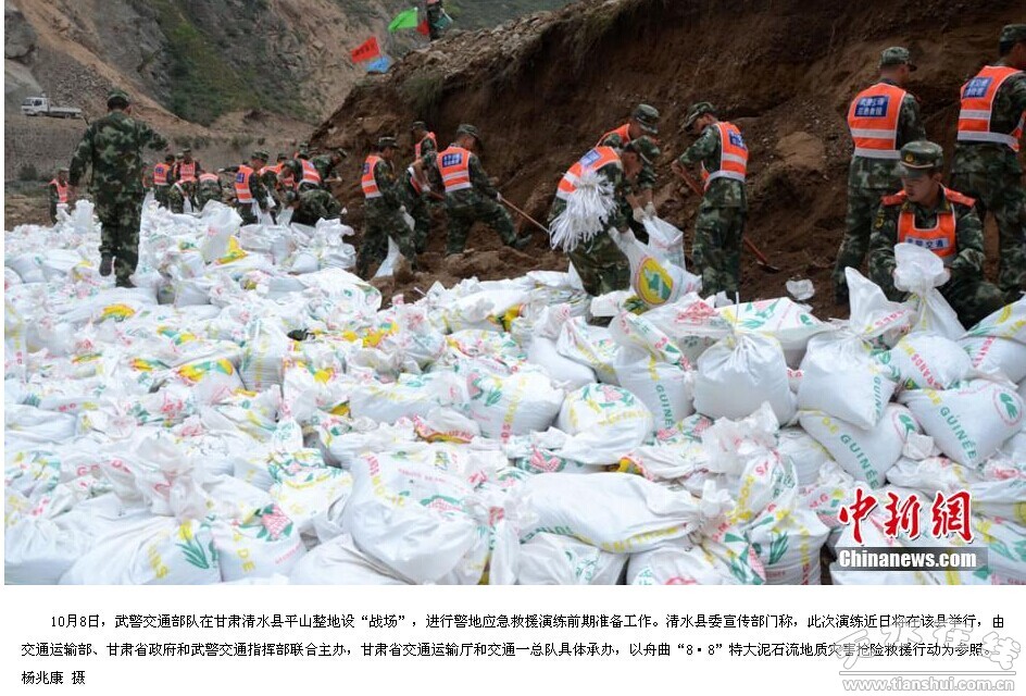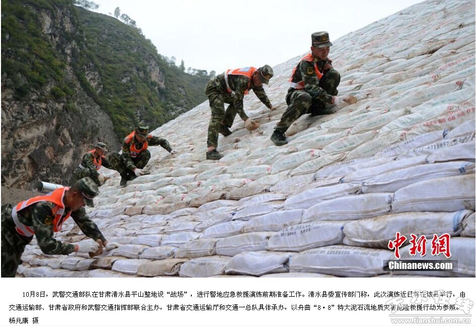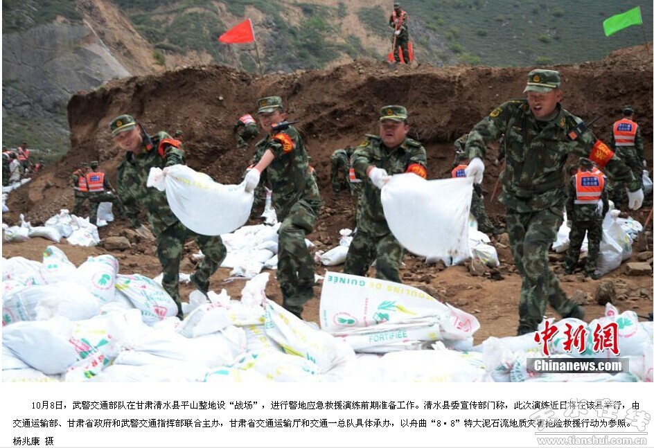 10月8日,武警交通部隊在甘肅清水縣平山整地設(shè)“戰(zhàn)場”,進行警地應(yīng)急救援演練前期準備工作。清水縣委宣傳部門稱,此次演練近日將在該縣舉行,由交通運輸部、甘肅省政府和武警交通指揮部聯(lián)合主辦,甘肅省交通運輸廳和交通一總隊具體承辦,以舟曲“8·8”特大泥石流地質(zhì)災(zāi)害搶險救援行動為參照。楊兆康 攝