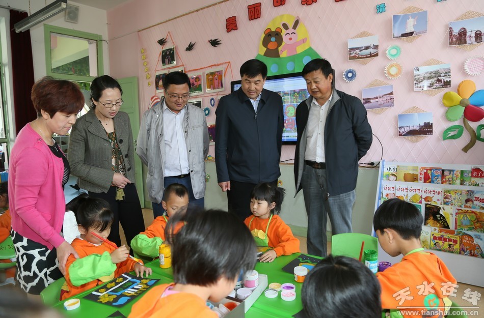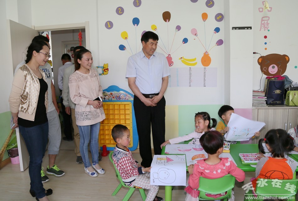 清水縣第一幼兒園里,一群孩子們正在草坪上表演著精彩的節(jié)目,一群孩子在室內(nèi)堆積木、畫畫、剪紙畫、玩游戲,他們天真爛漫、活潑可愛,正在健康快樂地成長。劉天波一行興致勃勃地觀看了孩子們表演的精彩節(jié)目,又觀看了孩子們制作的一些手工作品,還為一幼的孩子們發(fā)放了小足球、彩筆等東西。