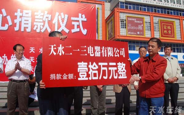 天水二一三總經(jīng)理倪筱仁主持召開了抗震救災(zāi)捐款動(dòng)員會(huì),向大會(huì)發(fā)出了抗震救災(zāi)捐款的倡議。他要求職工同志們立即行動(dòng)起來,以捐款的方式為災(zāi)區(qū)人民提供援助,幫助災(zāi)區(qū)人民挽救生命,重建家園,共渡難關(guān)。5月16日上午9時(shí),在天水市龍城廣場舉行的全市工商企業(yè)界抗震救災(zāi)現(xiàn)場捐款儀式上,總經(jīng)理倪筱仁代表企業(yè)現(xiàn)場捐款10萬元,表達(dá)了公司對災(zāi)區(qū)的一片愛心。