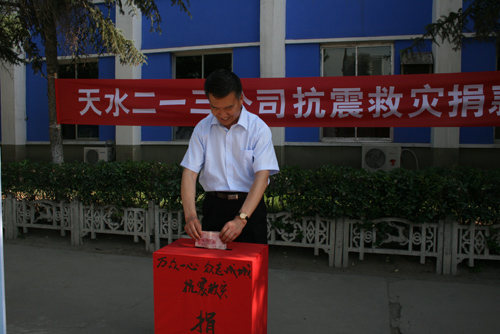 天水二一三公司黨委書記白天洪在西安出差期間,通過電話和公司其他領(lǐng)導(dǎo)研究捐款事宜,并于5月16日下午4時(shí)30從西安趕往公司后,即刻組織中層以上干部舉行現(xiàn)場捐款儀式,他強(qiáng)調(diào)指出,我們在這里舉行現(xiàn)場捐款儀式,就是要在抗震救災(zāi)的關(guān)鍵時(shí)刻,積極響應(yīng)中央和省、市的號召,充分發(fā)揮領(lǐng)導(dǎo)干部和工作骨干的示范帶頭和模范表率作用,通過實(shí)際行動(dòng),帶動(dòng)更多的力量、凝聚更多的愛心、融匯更多的真情救助災(zāi)區(qū)人民、以增強(qiáng)災(zāi)區(qū)人民萬眾一心、自強(qiáng)不息、戰(zhàn)勝災(zāi)害的信心,幫助災(zāi)區(qū)人民奮起抗災(zāi),渡過難關(guān)。