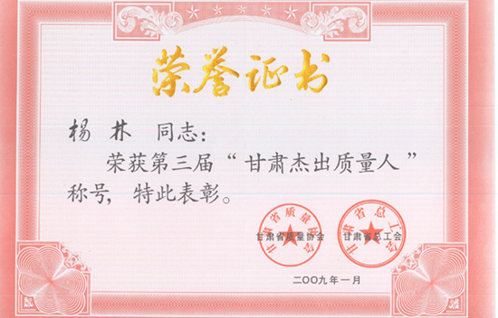 在二零零九年三月十三日于蘭州召開的甘肅省質量協(xié)會六屆一次會員代表大會暨質量工作表彰大會上,蘭州長城電工股份有限公司董事長,原天水二一三電器有限公司董事長楊林同志被甘肅省質量協(xié)會和甘肅省總工會授予 “甘肅省杰出質量人”光榮稱號,并頒發(fā)了榮譽證書和獎杯。