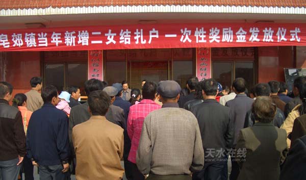 圖為皂郊鎮(zhèn)當年新增二女結(jié)扎戶一次性獎勵金發(fā)放儀式現(xiàn)場