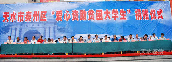 【本報(bào)訊】(記者 胡麗霞)8月28日,秦州區(qū)在市龍城廣場(chǎng)舉行“愛(ài)心資助貧困大學(xué)生”捐贈(zèng)儀式。秦州區(qū)各界人士和單位為全區(qū)100余名貧困大學(xué)生捐款41.5萬(wàn)元。