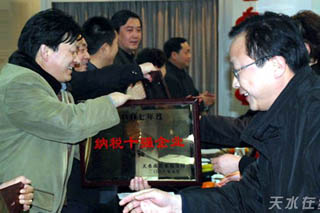 在慰問座談會上,秦州區(qū)區(qū)長周偉宣讀了秦州區(qū)政府的表彰決定。并向在2007年稅務工作中做出優(yōu)異成績的秦州區(qū)國稅局、地稅局、財政局分別給予獎金15萬元。