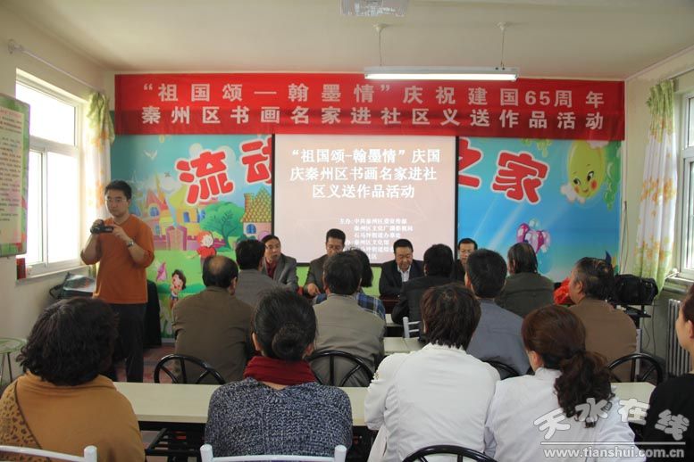 金秋十月,丹桂飄香;盛大節(jié)日,舉國歡慶。在慶祝祖國65華誕之際,由中共秦州區(qū)委宣傳部、秦州區(qū)文化廣播影視局、石馬坪街道辦事處主辦,區(qū)文化館、籍河南路第一社區(qū)承辦的“祖國頌—翰墨情”慶祝建國65周年秦州區(qū)書畫名家進(jìn)社區(qū)義送作品活動(dòng)在籍河南路第一社區(qū)舉行。