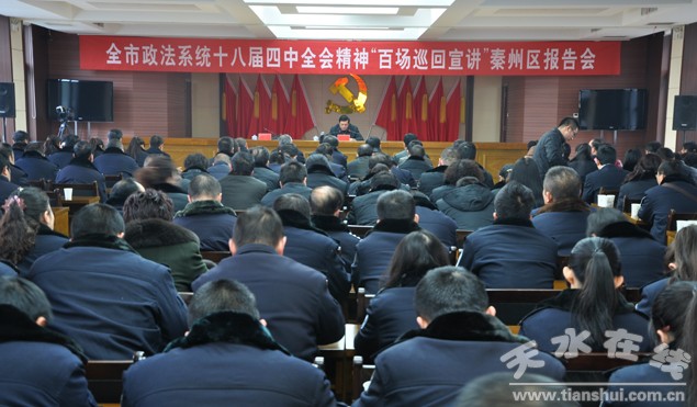 (秦州區(qū)外宣辦)為深入貫徹落實省委王三運書記在蘭州宣講黨的十八屆四中全會精神時提出的八個方面要求和省、市委關于學習宣傳貫徹黨的十八屆四中全會精神的通知要求,12月16日,市委常委、政法委書記趙衛(wèi)東帶頭深入秦州區(qū)政法系統(tǒng)開展十八屆四中全會精神首場“百場巡回宣講”活動。