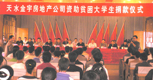記者 霍立紅 周文濤 8月25日,秦州區(qū)委禮堂掌聲陣陣,天水金宇房地產(chǎn)開發(fā)有限責任公司資助貧困大學生捐款儀式正在這里舉行。60名今年考入高校的貧困學子每人領到了5000元資助金。市領導張廣智、柴金祥、張懷仁、韓一兵、蘇愛生、王欽錫和天水金宇房地產(chǎn)開發(fā)有限責任公司董事長穆斌出席捐款儀式并為受助大學生頒發(fā)資助金。