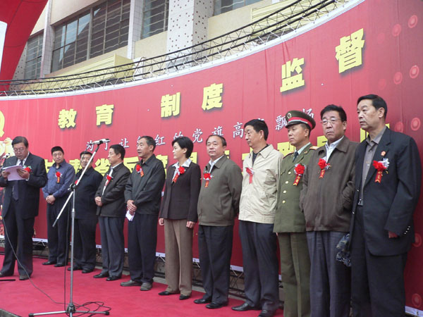 出席今天開展儀式的有:省紀(jì)委常委、省監(jiān)察廳副廳長王永紅;市委書記趙春;市委副書記、市長張廣智;市政協(xié)主席王志榮;市委副書記杜松奇;市委常委、副市長馮沙駝;市委常委、組織部長王世華;市委常委、天水軍分區(qū)政委張軍;市人大副主任白志家、盧雙雙;市政府副市長任伯年;市政協(xié)副主席蘇愛生;市法院院長吉秦生以及市紀(jì)委、市委辦公室、市人大辦公室、市政府辦公室、市政協(xié)辦公室、市委組織部、宣傳部、統(tǒng)戰(zhàn)部、政法委、市法院、黨校、工商局、國稅局、地稅局等機(jī)關(guān)單位全體黨員干部。