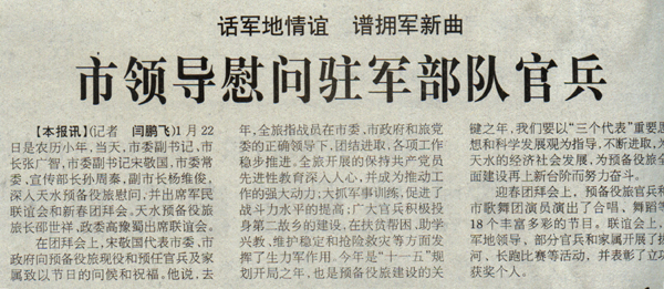 1月22日是農(nóng)歷小年,當(dāng)天,市委副書記、市長張廣智,市委副書記宋敬國,市委常委、宣傳部長孫周秦,副市長楊維俊,深入天水預(yù)備役旅慰問,并出席軍民聯(lián)誼會和新春團(tuán)拜會。天水預(yù)備役旅旅長邵世祥、政委高豫蜀出席聯(lián)誼會。