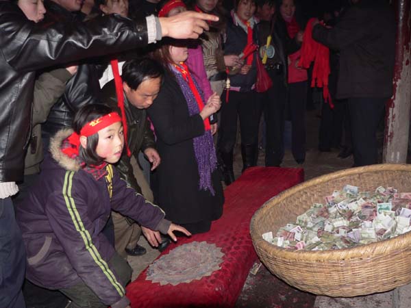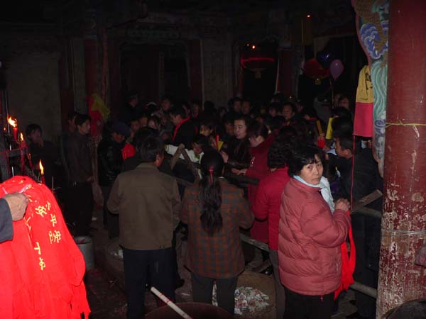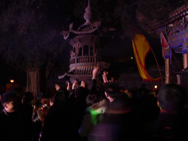 “朝觀”最為隆重的儀式便是農(nóng)歷正月初九零時(shí)在玉皇殿點(diǎn)燃頭柱香。而今年的初八夜間,積雪還未完全消融的玉泉觀內(nèi)就已人潮涌動(dòng),人們扶老攜幼等候在玉皇殿外。初九凌晨,“朝觀”正式開始,人們爭(zhēng)先恐后地為玉皇大帝點(diǎn)燃第—柱香。玉皇殿是玉泉觀現(xiàn)存最為宏偉的古建筑群,殿內(nèi)黃絲絨遮起大龕,塑有玉皇大帝像,兩壁有彩繪三十二天朝玉帝巨幅壁畫。