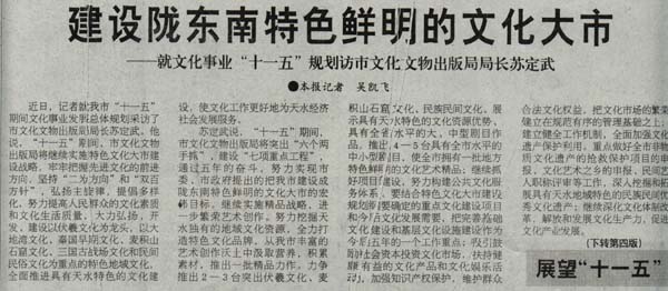 蘇定武說,“十一五”期間,市文化文物出版局將以加快發(fā)展為主題,發(fā)揮優(yōu)勢(shì),突出重點(diǎn),形成特色,逐步建立和完善與我市經(jīng)濟(jì)社會(huì)發(fā)展要求相適應(yīng)的文化發(fā)展格局,形成符合社會(huì)主義文化發(fā)展規(guī)律的文化管理運(yùn)行機(jī)制,構(gòu)筑與人民群眾日益增長(zhǎng)的文化需求相適應(yīng)的文化生產(chǎn)服務(wù)體系,用先進(jìn)文化全面占領(lǐng)城鄉(xiāng)文化陣地。通過五年的努力,使天水擁有一批較先進(jìn)的文化設(shè)施、更多優(yōu)秀的文化藝術(shù)人才、更多的具有地方特色的文化藝術(shù)產(chǎn)品和一批較發(fā)達(dá)的文化產(chǎn)業(yè),使天水文化綜合實(shí)力明顯增強(qiáng),為把天水建成與國家歷史文化名城相適應(yīng)、相配套,并體現(xiàn)以伏羲文化為龍頭的五大歷史文化和民間民俗文化的特色文化大市奠定良好的基礎(chǔ)。