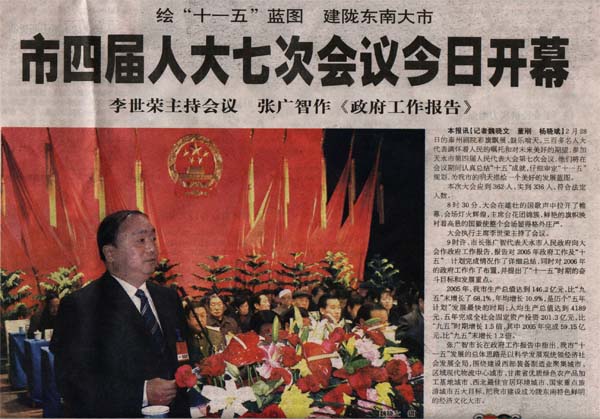 9時許,市長張廣智代表天水市人民政府向大會作政府工作報告,報告對2005年政府工作及“十五”計劃完成情況作了詳細總結,同時對2006年的政府工作作了布置,并提出了“十一五”時期的奮斗目標和發(fā)展重點。