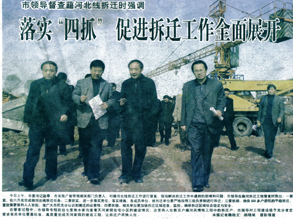 今日上午,市委書記趙春、市長張廣智帶領(lǐng)相關(guān)部門負(fù)責(zé)人,對藉河北線拆遷工作進(jìn)行了督查,現(xiàn)場解決拆遷工作中遇到的困難和問題。市領(lǐng)導(dǎo)在藉河拆遷工地督查時指出:一要抓緊,在六月底完成藉河北線拆遷任務(wù);二要抓實,進(jìn)一步靠實責(zé)任,落實措施,成員單位、被拆遷單位要嚴(yán)格按照三級負(fù)責(zé)制進(jìn)行拆遷;三要抓細(xì),確保600多戶居民的平穩(wěn)拆遷,安置政策要做到人人皆知,使廣大市民充分認(rèn)識到搬遷的必要性;四要抓緊,相關(guān)單位要加強(qiáng)拆遷區(qū)域巡查,監(jiān)控,確保拆遷區(qū)域社會穩(wěn)定和安全。