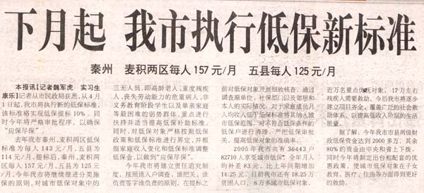 去年我市秦州、麥積兩區(qū)低保標準為每人143元/月,五縣為114元/月。提標后,秦州、麥積兩區(qū)每人157元/月,五縣為125元/月。今年我市將繼續(xù)推進分類施保的原則,對城市低保對象中的三無人員,即高齡老人、重度殘疾人、喪失勞動能力的危重病人、非義務(wù)教育階段學生以及單親家庭等最困難的弱勢群體,重點進行扶持并適當提高低保補助標準。同時,對低保對象嚴格按照低保政策和低保標準進行界定,并根據(jù)家庭收入變化和低保標準調(diào)整低保金,以做到“應(yīng)保盡!。
