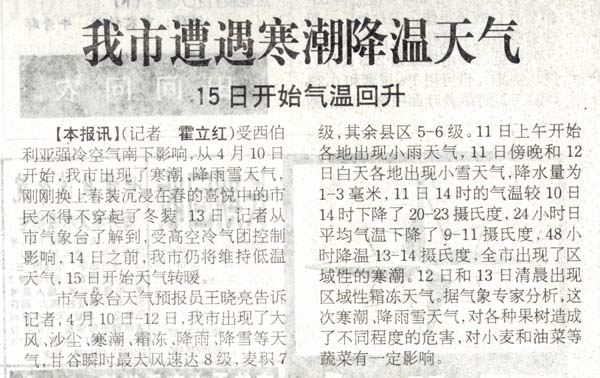 【本報訊】(記者 霍立紅)受西伯利亞強冷空氣南下影響,從4月10日開始,我市出現(xiàn)了寒潮、降雨雪天氣,剛剛換上春裝沉浸在春的喜悅中的市民不得不穿起了冬裝。13日記者從市氣象臺了解到,受高空冷氣團控制影響,14日之前,我市仍將維持低溫天氣,15日開始天氣轉(zhuǎn)暖。