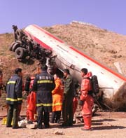 據(jù)了解,10日下午宿州籍東風(fēng)大貨車在甘肅省天水境內(nèi)因剎車失靈,連續(xù)撞上兩輛甘肅籍大客車,造成28人死亡的特大事故。經(jīng)當(dāng)?shù)亟痪块T調(diào)查,這起特大交通事故的原因 目前已經(jīng)明確:皖L-01848東風(fēng)康明斯大貨車,在限速40公里/小時(shí)的路段,以約100公里/小時(shí)的速度超速行駛,車輛在左轉(zhuǎn)彎時(shí),由于離心力作用,向左側(cè)傾失控。超過中心線,貨車貨箱左前角與甘E-04317號(hào)客車左側(cè)相撞后,繼續(xù)前行又與甘A-22665大客車正面相撞。
