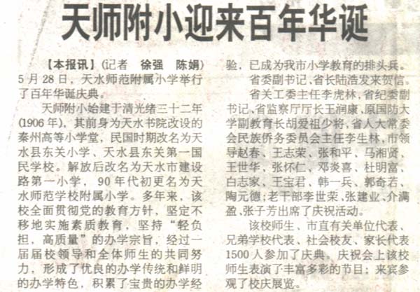 【本報(bào)訊】(記者 徐強(qiáng) 陳娟)5月28日,天水師范附屬小學(xué)舉行了百年華誕慶典。