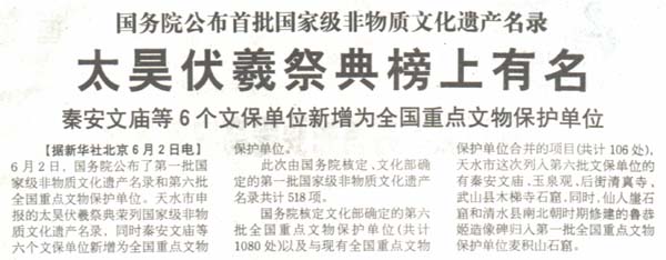 【據(jù)新華社北京6月2日電】6月2日,國務(wù)院公布了第一批國家級非物質(zhì)文化遺產(chǎn)名錄和第六批全國重點文物保護單位。天水市申報的太昊伏羲祭典榮列國家級非物質(zhì)文化遺產(chǎn)名錄,同時秦安文廟等六個文保單位新增為全國重點文物保護單位。