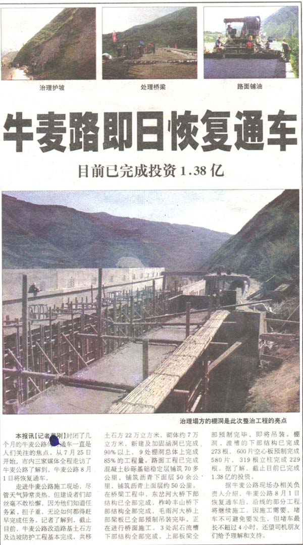 本報(bào)訊【記者董剛】封閉了幾個(gè)月的牛麥公路何時(shí)通車一直是人們關(guān)注的焦點(diǎn)。從7月25日開始,市內(nèi)三家媒體全程走訪了牛麥公路了解到,牛麥公路8月1日將恢復(fù)通車。