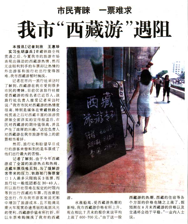 本報訊【記者劉欣 王惠珍實習生胡彥兵】青藏鐵路全線貫通之后,今夏我市的旅游市場表現(xiàn)出強勁的西藏游熱情,然而無法順利到手的車票卻讓熱情的外出游客和旅行社出行變得困難,我市西藏游暫時擱淺。