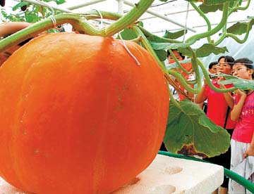 這是甘肅省天水市高新技術(shù)示范園區(qū)種植的巨型南瓜(8月11日攝)。這個采用沙培法種植的南瓜自掛果至今僅30多天,就已長到80多斤,據(jù)工作人員預(yù)計,這個南瓜有望長至400多斤。