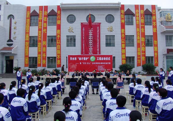 天水市“幼才保護”工程由天水市委統(tǒng)戰(zhàn)部、市教育局、市慈善總會、市工商聯(lián)、市婦聯(lián)主辦,市建設(shè)學(xué)習(xí)型城市發(fā)展戰(zhàn)略研究會共同發(fā)起的一項智力工程。工程依托具有一定資質(zhì)的辦學(xué)機構(gòu),免費為家庭經(jīng)濟特別困難的優(yōu)秀高初中畢業(yè)生,提供繼續(xù)學(xué)習(xí)深造的機會。工程的主要分項目“百萬·百人”農(nóng)村貧困生愛心傳遞助學(xué)成才活動,由全國勞模,省、市人大代表,天水計算機專修學(xué)院院長王晉積極倡導(dǎo)并籌資100萬元啟動資金,準(zhǔn)備為100名家庭困難的農(nóng)村優(yōu)秀學(xué)生提供資助。9月23日,“大齡女童班”和“優(yōu)智青少年班”兩個班正式開班,有75名農(nóng)村高初中貧困畢業(yè)生如期進校。