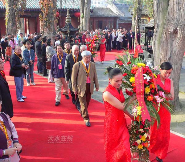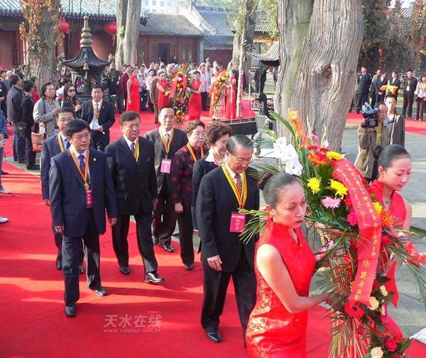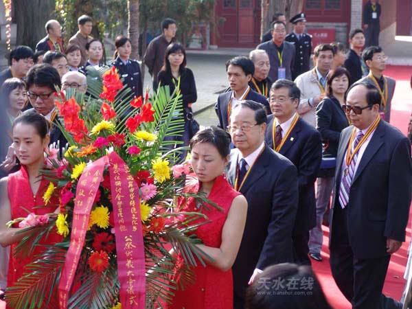 出席今天祭祀活動的國家領(lǐng)導(dǎo)人有:全國政協(xié)副主席張懷西先生。參加祭祀儀式的還有:中國國民黨中央評議委員會主席團(tuán)主席、世界客屬總會榮譽(yù)會長饒穎奇先生,新黨前召集人謝啟大女士,全國人大常委、民進(jìn)中央副主席王立平,中華海外聯(lián)誼會副秘書長傅鐵生,民進(jìn)中央秘書長、葉圣陶研究會副會長兼秘書長趙光華,中華民族文化促進(jìn)會副主席王石、金堅范,中華伏羲文化研究會會長賈斌,中華炎黃文化研究會第一副會長、國家文物局原局長張文彬,甘肅省人大常委會副主任杜穎,全國政協(xié)常委、甘肅省政協(xié)副主席周 宜興,中共天水市委書記、天水市人大常委會主任趙春,中共天水市委副書記、天水市人民政府市長張廣智,政協(xié)天水市委員會主席王志榮等國家部委和省市領(lǐng)導(dǎo)、港澳臺和大陸研究中華文化的專家學(xué)者、新聞媒體記者共叁佰余人。