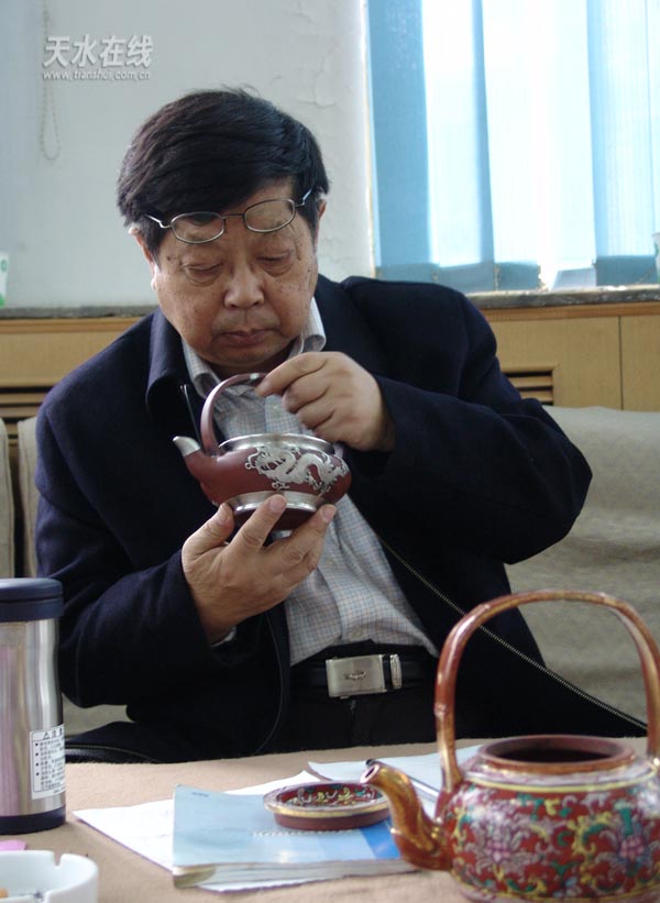 圖為華義武在鑒定紫砂器