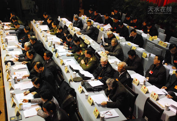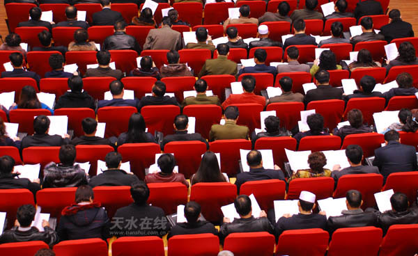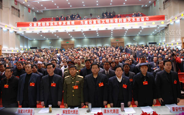 會場內(nèi)華燈璀璨,生機(jī)盎然,洋溢著莊嚴(yán)、熱烈、民主、團(tuán)結(jié)、奮進(jìn)的氣氛。巨大的國徽懸掛在主席臺帷幕中央,兩旁排列著鮮艷的紅旗。代表們滿懷豪情,在這里共同謀劃在新的起點(diǎn)上實(shí)現(xiàn)天水崛起的發(fā)展大計(jì),譜寫和諧天水的新篇章。