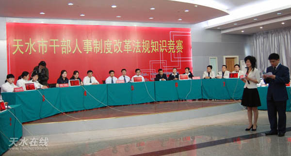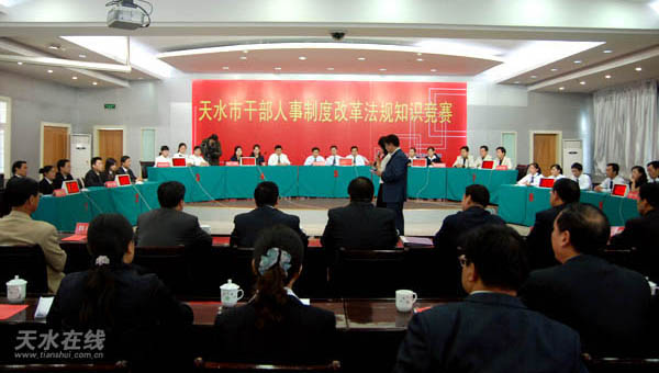 為進(jìn)一步深入學(xué)習(xí)宣傳公務(wù)員法及中央干部人事制度改革一系列法規(guī)性文件,推進(jìn)我市干部人事制度改革,為建設(shè)高素質(zhì)的公務(wù)員隊(duì)伍營(yíng)造良好的選人用人環(huán)境,4月29日下午,在天辰大酒店四樓多功能會(huì)議廳,舉辦了天水市干部人事制度改革法規(guī)性文件電視知識(shí)競(jìng)賽。這次競(jìng)賽由市委組織部主辦,市委宣傳部、天水電視臺(tái)、各縣區(qū)委組織部協(xié)辦,出席這次會(huì)議的有市委副書(shū)記宋敬國(guó),市委常委、組織部長(zhǎng)王世華,市委組織部、市委宣傳部、天水廣播電視臺(tái)等有關(guān)部門(mén)的負(fù)責(zé)人。