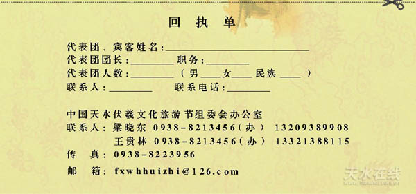 據(jù)市節(jié)會(huì)辦的相關(guān)人士介紹,針對(duì)“全球華人祭祖”這一精神,第19屆公祭中華人文始祖伏羲大典暨中國(guó)天水伏羲文化旅游節(jié)決定一改往年靠電話、傳真、信函等方式邀請(qǐng)相關(guān)單位和個(gè)人參會(huì)的做法,而是借助網(wǎng)絡(luò)快捷、高效、廣泛的特點(diǎn),向全球發(fā)出邀請(qǐng),對(duì)方可以以電子郵件的形式直接發(fā)回回執(zhí)單。同時(shí)公布了天水在線(www.werkai.cn )的網(wǎng)址,以方便各方人士全方位了解伏羲文化旅游節(jié)的動(dòng)態(tài)、活動(dòng)項(xiàng)目等有關(guān)情況。