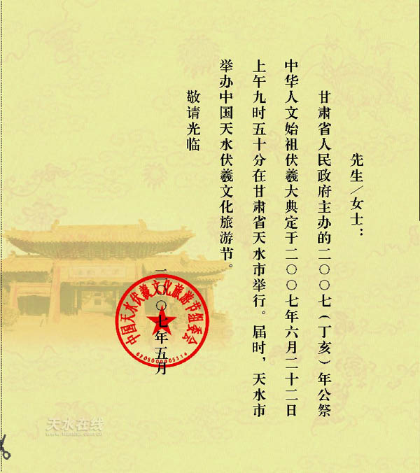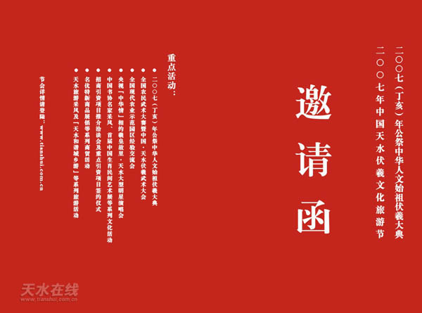 甘肅省人民政府主辦的二○○七(丁亥)年公祭中華人文始祖伏羲大典定于二○○七年六月二十二日上午九時(shí)五十分在甘肅省天水市舉行。屆時(shí),天水市舉辦中國(guó)天水伏羲文化旅游節(jié)。