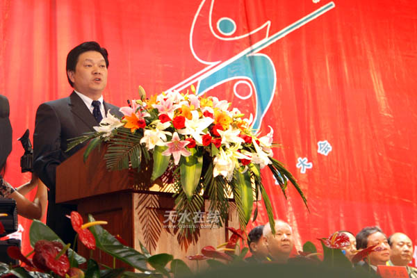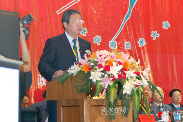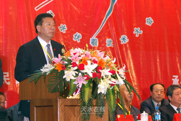于再清在講話中說,天水是一個(gè)文化底蘊(yùn)深厚的歷史文化名城,是中華民族和中華文明的重要發(fā)祥地之一,天水作為我國西部重要的工業(yè)城市和優(yōu)秀旅游城市,處處呈現(xiàn)出無限生機(jī)和活力。天水體育事業(yè)發(fā)展迅速,取得了驕人的成績,已有兩個(gè)全國“武術(shù)之鄉(xiāng)”,一個(gè)全國“群眾體育先進(jìn)縣”,全民健身活動(dòng)蓬勃發(fā)展。同時(shí),天水作為伏羲武術(shù)的發(fā)祥地,有著深厚的武術(shù)文化傳統(tǒng)!胞湻e山杯”全國農(nóng)民武術(shù)大賽暨中國·天水伏羲武術(shù)大會(huì)的舉行,必將進(jìn)一步促進(jìn)和深化天水與全國各地武術(shù)文化交流,掀起全民健身活動(dòng)的新高潮,為推動(dòng)我國農(nóng)民體育運(yùn)動(dòng)發(fā)展,培養(yǎng)新型農(nóng)民,加快社會(huì)主義新農(nóng)村建設(shè)做出新的貢獻(xiàn)。