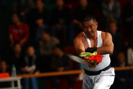 6月19日,運動員在比賽中演示劍術(shù)。當(dāng)日,首屆全國農(nóng)民武術(shù)大賽在甘肅省天水市開賽。新華社記者聶建江攝